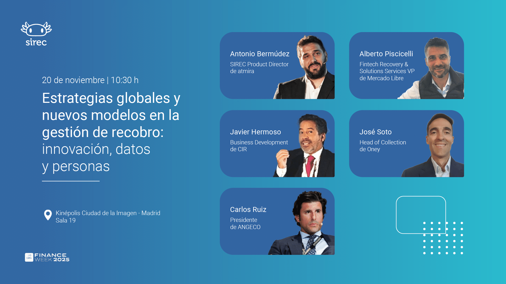 El próximo 20 de noviembre, desde SIREC  estaremos presentes en el panel «Estrategias globales y nuevos modelos en la gestión de recobro: innovación, datos y personas». Antonio Bermúdez compartirá escenario con Alberto Piscicelli (Fintech Recovery & Solutions Services VP de Mercado Libre), Javier Hermoso (Business Development de CIR) y José Soto (Head of Collections de Oney). Un espacio para debatir sobre cómo la tecnología está transformando el sector.